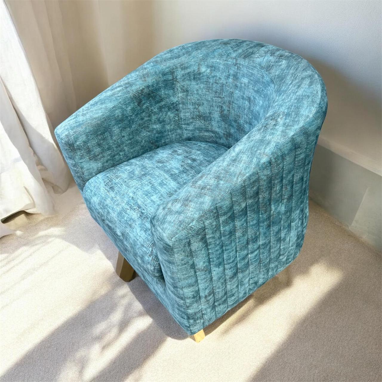 El tapizado suave y sus delicadas costuras verticales decorativas aportan un toque sofisticado y contemporáneo, convirtiéndola en una pieza protagonista dentro de cualquier ambiente. Sus patas discretas elevan el diseño con ligereza, manteniendo una estética limpia y elegante.